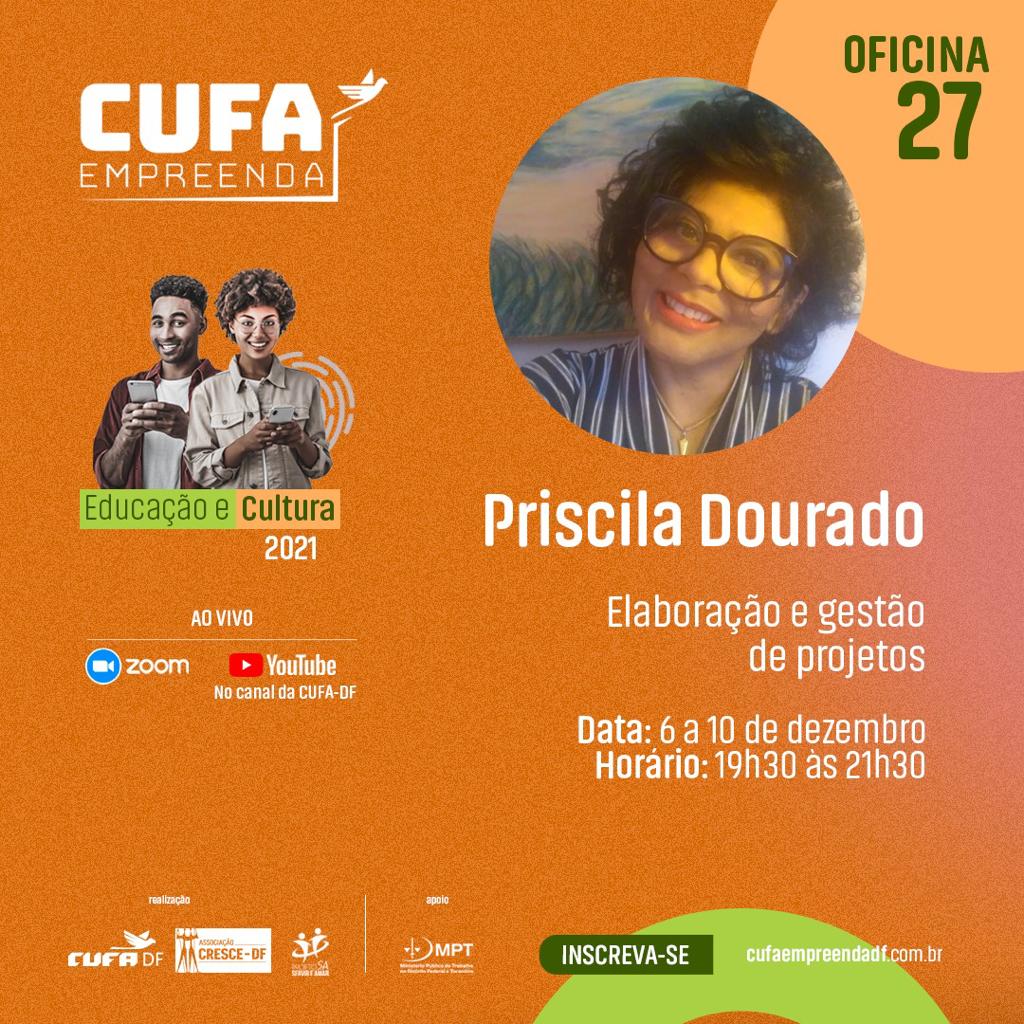 Ministrante: Priscila Dourado é professora universitária. Na pandemia, decidiu atuar como empreendedora social. Criou e coordenou o Projeto Ipê Digital (2021), visando a inclusão sociodigital de mulheres negras empreendedoras no Brasil. Foi professora-substituta na UnB, até 2019. Trabalha na Faculdade Senac-DF. É colaboradora do Instituto Plataforma Brasil com foco em ações educativas para jovens sobre vida e direitos humanos. Pós-doutora em Direitos Humanos, doutora em Educação, mestre em Administração, especialista e graduada em Administração, fez curso de curta duração em Gestão e Negócios na Universidade de New Hampshire.