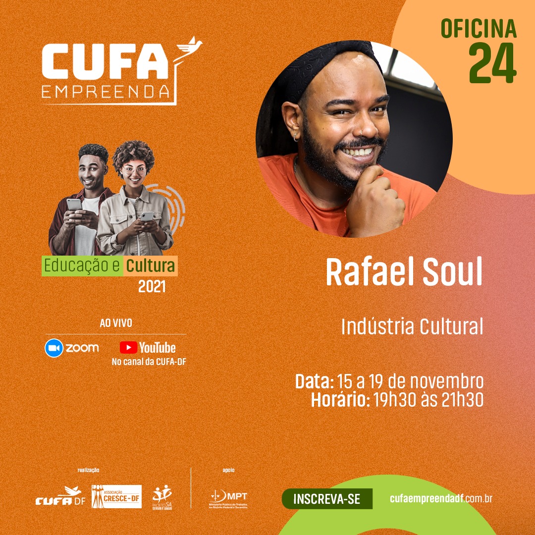 Apostando no conceito de Educação e Cultura como novo eixo central, o Cufa Empreenda abre quatro cursos: Indústria Cultural de 15 a 19/11; Arte, cultura e sustentabilidade de 22 a 26/11; Economia Criativa de 29/11 a 03/12; e Elaboração e gestão de projetos de 6 a 10/12. O primeiro deles já conta com inscrições abertas no site do projeto, os demais estarão disponíveis em breve.