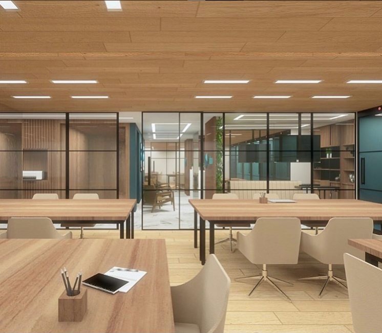 Os materiais mais utilizados em ambientes corporativos são as divisórias de vidro (blindex), esta solução não prejudica a sensação de amplitude dos ambientes e permite a permeabilidade visual de toda a equipe em produção.