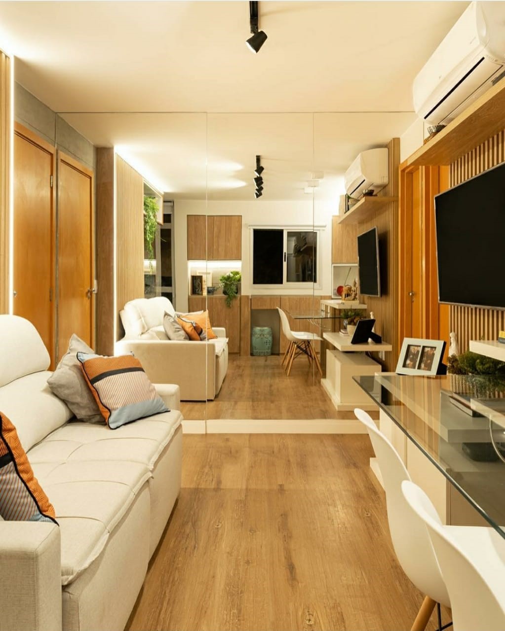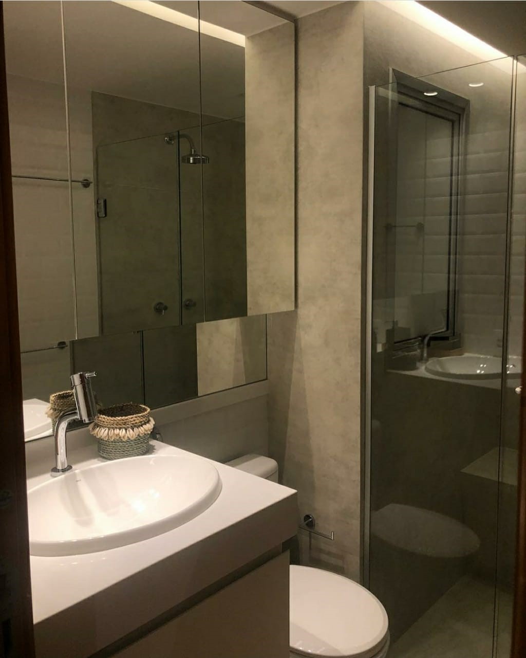 É muito importante se atentar ao local onde se pretende instalar o espelho. Ele é um artifício excelente para ampliar os ambientes e esconder elementos estruturais. Mas um grande cuidado que se deve ter é não se empolgar demais e instalar espelho no cômodo todo! Imagina, ele possui a capacidade de refletir o espaço, logo, se você fixar um espelho frente à outro a sensação que ele irá gerar é a de um enorme desconforto, pois reflexo de ambos gera um efeito infinito.